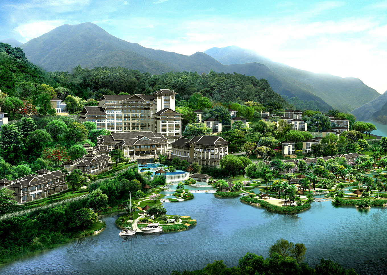 福州海峽文化村度假景區項目位于福建省福州市貴安溫泉旅游度假區東側,地處古碑曰“青甲池”之境。南北長1000米,東西寬約450米,北臨敖江,南側有西溪貫穿南北,東、南兩面環山。