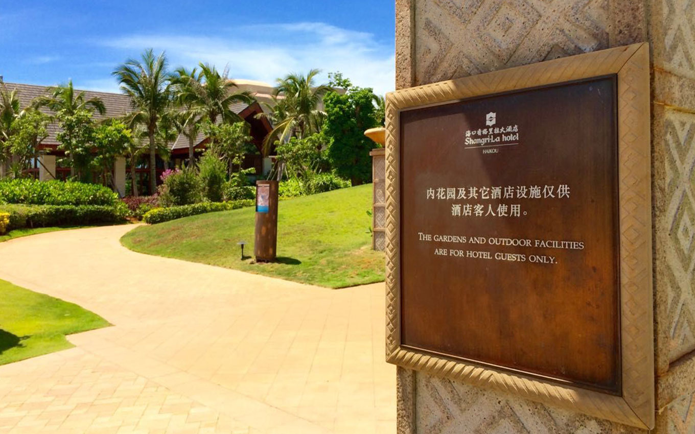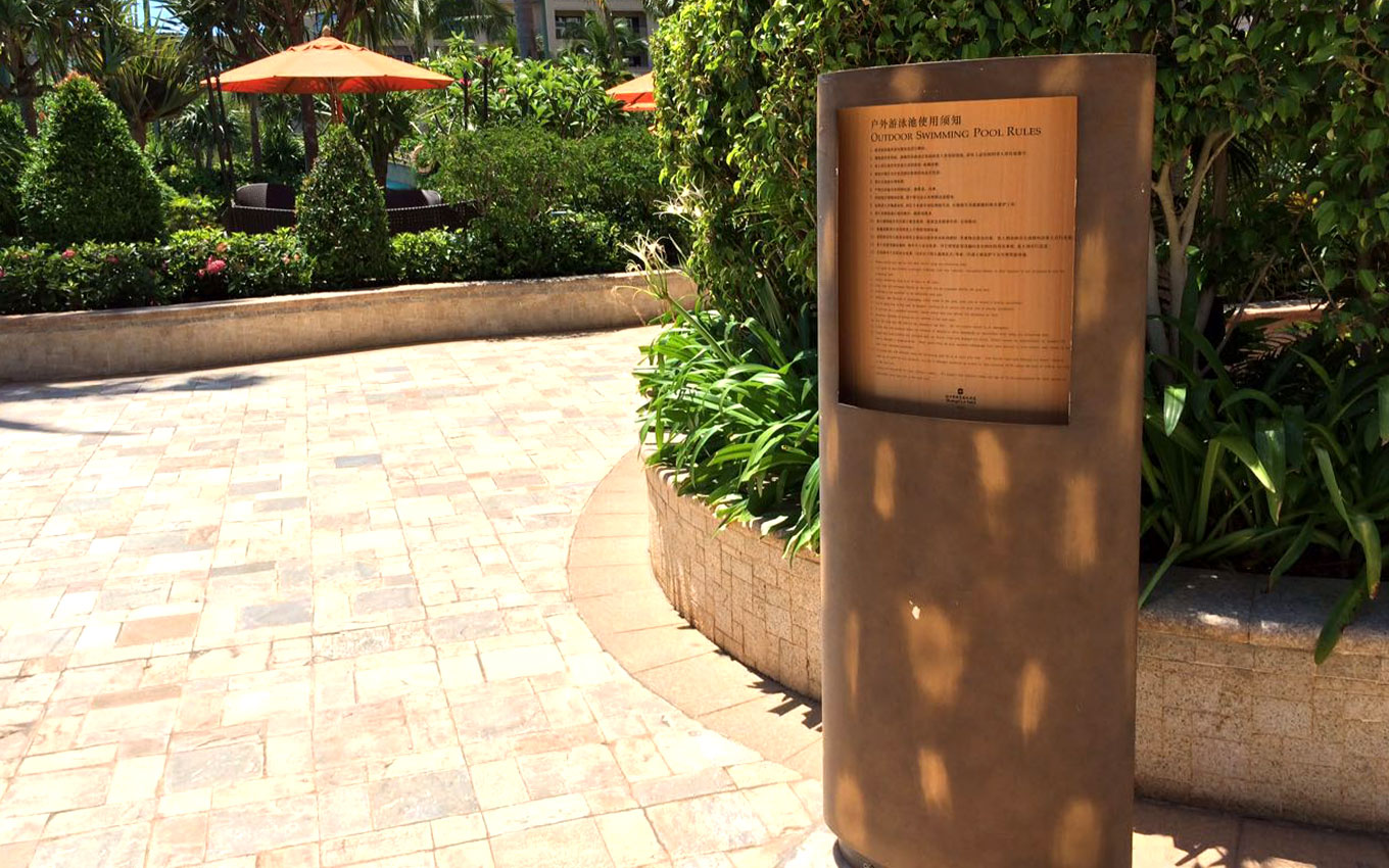 海口香格里拉大酒店位于??谑卸燃僦行?,海邊的天然美景、海岸線的風(fēng)光、椰風(fēng)的靜謐之處、這是??诙燃偬焯?,海口香格里拉大酒店標(biāo)識設(shè)計以海洋、海口椰樹風(fēng)光為設(shè)計創(chuàng)意,室外以古銅打造陽光下的度假方案導(dǎo)視設(shè)計,室內(nèi)以沙石雕花邊工藝制作,結(jié)合金屬質(zhì)感的點(diǎn)綴,形成鮮明的品質(zhì)感。